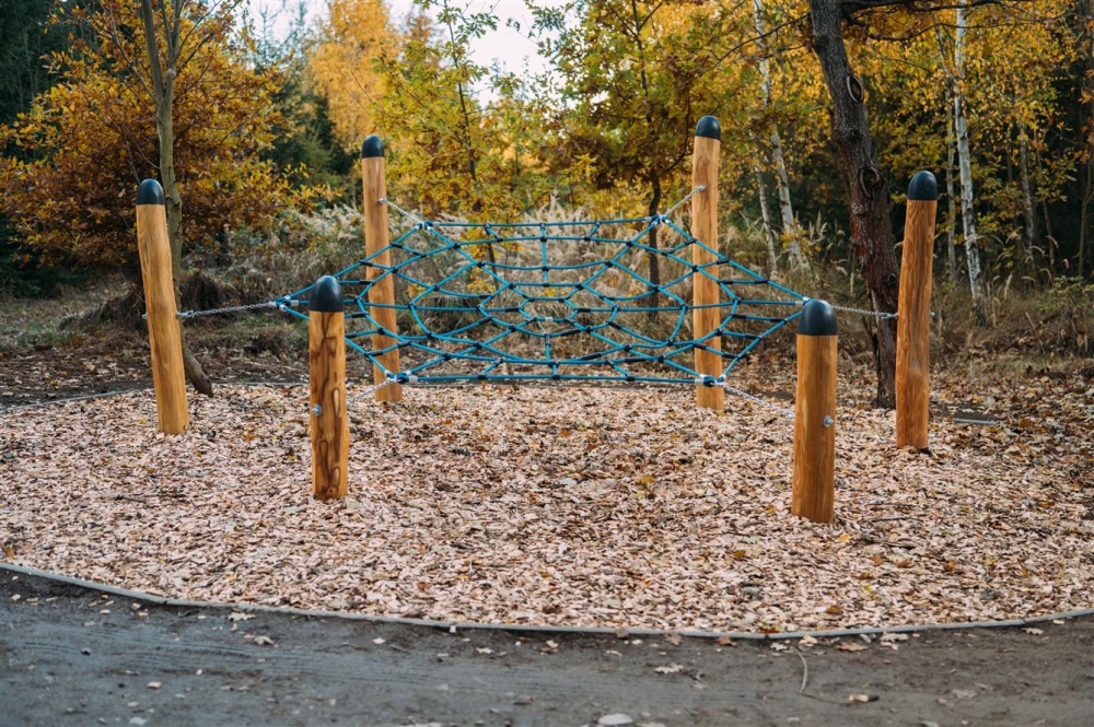 Pavučina – síť z lana zavěšená na sloupech z jedlového dřeva, doplněná tabulí o pavoucích v našich lesích.
