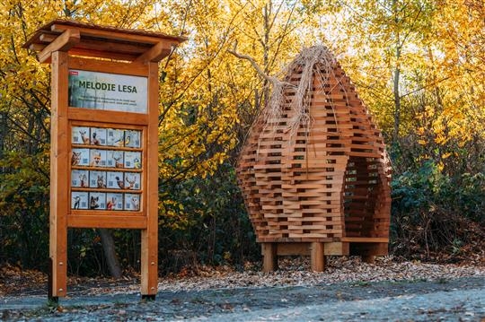 Ptačí hnízdo – konstrukce z dubu s rákosovými detaily, doprovázena informacemi o ptactvu v kraji.